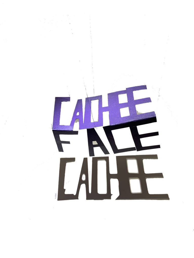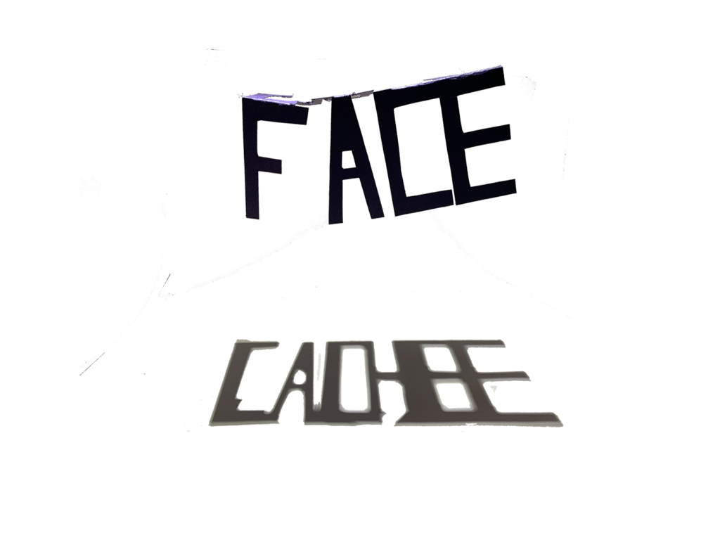 “FACE” que l’on voit de face, et “CACHE” seulement lorsque la lumière est placé au dessus. D’où le fait que cela crée “FACE CACHÉE”.